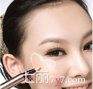 在颧骨上打高光,会让脸部更加饱满,也能修饰眼角的皱纹。先用高光笔在颧骨的位置画上心形的区域,将高光的位置确定好,再用指腹将高光推开,可强化脸部的轮廓。