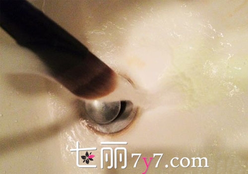 三、顺着刷毛讲泡沫冲洗干净,切记,千万不要逆着刷毛冲洗。也可在一个容器里装上干净的清水,然后把化妆刷放进去打圈搅拌,洗干净里面的粉底。