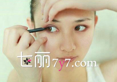步骤6用手指提出眉毛处,画内眼线,双眼皮妹子只需要画好内眼线,眼尾稍稍拉出即可,不需要再画一条外眼线。画好眼线后,用刷子沾黑色的眼影在下眼睑的眼尾1/3的位置来回扫扫,让上下眼线也能够自然衔接。