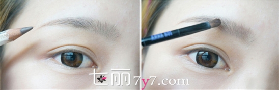 STEP2:先从眉毛开始,不光是允儿还是韩国妹子都是比较淡的眉毛,所以下笔一定要轻,有个大致的眉形就行了。用美粉填充,整个过程都是要轻,过渡下眉毛的颜色;