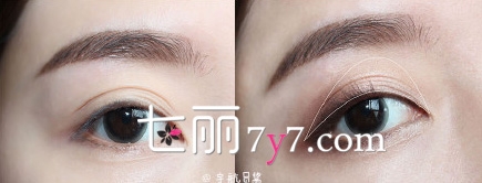步骤3用淡棕色的眼影在眼尾的位置晕染,加深眼窝的色泽。