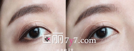 步骤2用粉色的眼影在白色虚线范围内涂抹,不用反复涂抹,显色即可。