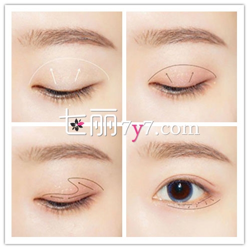 步骤3用肉粉色眼影沿着睫毛根部小范围的晕染,眼尾处加大晕染范围,过度要自然。