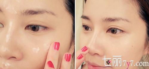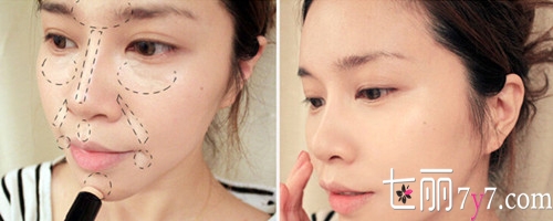 Step2:粉底液均匀涂抹在脸部,用高光笔在卧蚕、鼻梁、下巴等(如图所示)涂抹,用手指轻轻晕开,这样高光会更自然,能很好的起到立体的效果,mm们在暗沉的部位也可以进行涂抹修饰;