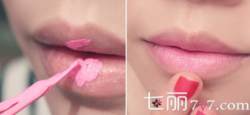 Step6:用粉色的唇彩从嘴唇中间开始涂抹,然后慢慢晕开,唇色深的mm可在涂之前涂上裸色的唇膏,能让唇彩的颜色更好的呈现出来。这款妆容甜美可爱,约会上班都很实用哦!