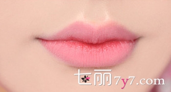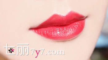 Step5:教大家一款画雾面嘴唇的方法,先用大红色的口红涂满整个嘴唇,用棉签将嘴唇边界晕染开来,使嘴唇的边界不再明显,用纸巾轻轻按压上下嘴唇,让颜色变得自然,最后轻轻沾上些粉饼盖在嘴唇上面,就能达到像雾面妆感的嘴唇了。