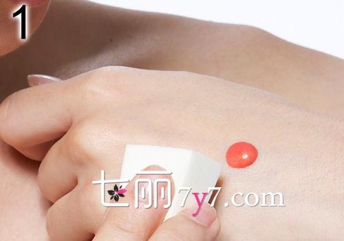 第一步:将液体腮红挤出1~2滴在手背上,然后用干净的化妆海绵轻轻沾取。微笑起来让笑肌自然凸显,以笑肌为起点,将沾取了液体腮红的化妆棉以放射状形式轻轻推开。要记住的是,速度一定要快,否则腮红可能会干掉。