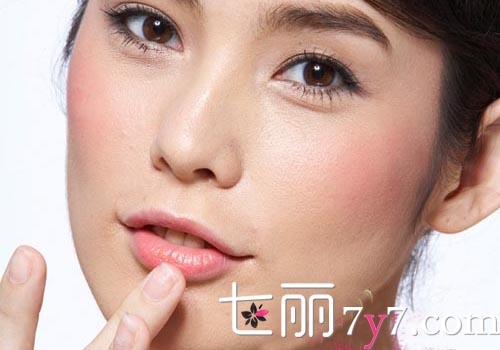 第三步:手指沾取液体腮红,轻点在嘴唇中央,并且稍稍往两边推开,不用一定要填满双唇,不强调边缘让双唇色则看来更自然。