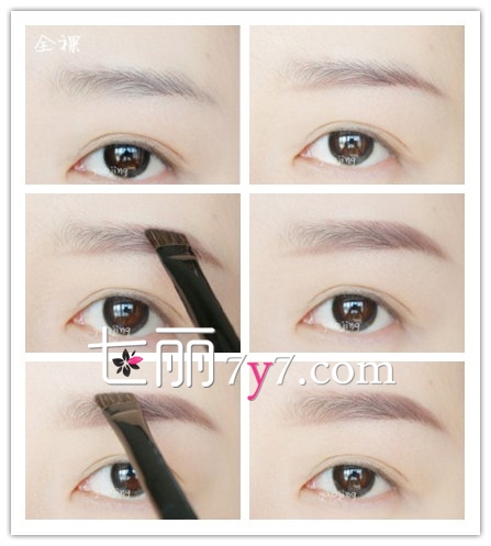 步骤3:用刷子确定好眉峰的位置,下笔的时候从眉峰开始,眉峰的色泽是整条眉毛最深的,眉头较浅。