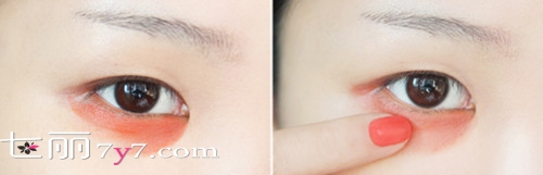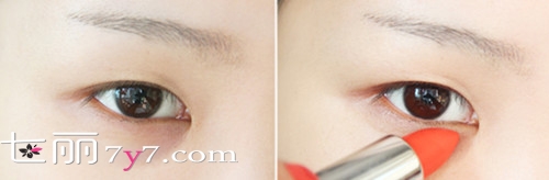 Step3:将口红涂抹于眼部黑眼圈的地方