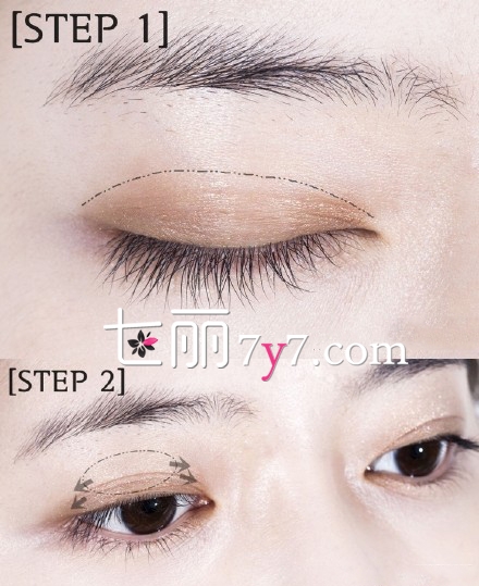 步骤2用裸肤色带有珠光的眼影在眼部中间晕染开,做为提亮。