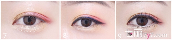 Step8:选择深蓝色的眼线笔,紧贴着眼皮画出细长的眼线,眼尾处可微微上扬增添俏皮感;