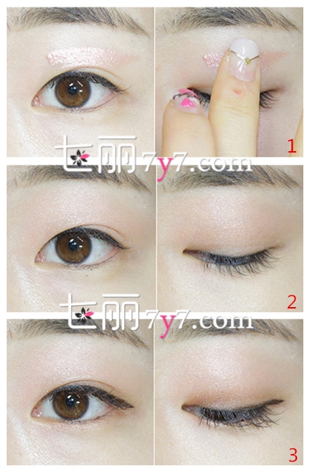 Step1:用桃粉色的眼影涂在眼窝处进行打底;