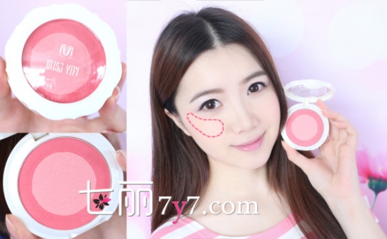 7、腮红画法是保持微笑,找到苹果肌位置斜着像太阳穴位置扫圈圈,腮红成长形更显得脸部会瘦点。要是脸颊太瘦想要饱满的苹果肌的效果就微笑,腮红扫在苹果肌下面一点的位置像外画出可爱的圆圆的粉脸蛋。