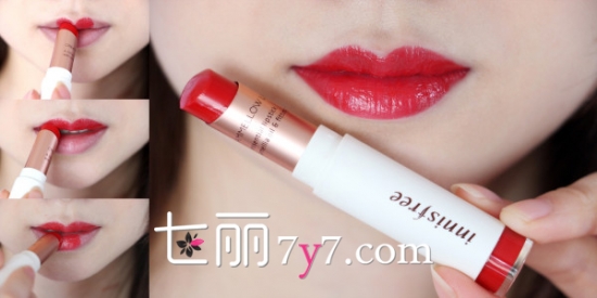 8、涂唇膏的时候,先涂上唇的最高唇峰部位,定好点再延伸涂抹,下唇先定好最低点,然后依次像左右涂抹开来。这个颜色亮红色!很热情有活力。