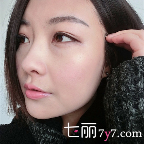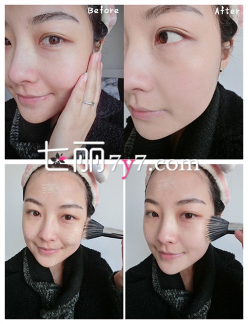 化妆前mm肤色泛红,有些许痘印,妆后清新自然,肤色看起来也基本一致(利用粉底刷更好的将粉底服帖于脸部,使妆感更加清透自然)。