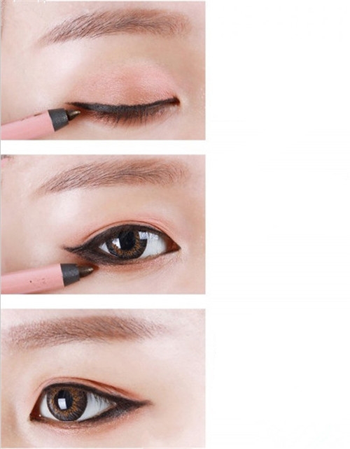 第四步:眼线从严重中间开始画,先画到眼尾,平拉出去,再用眼头连接到眼中,注意一定要贴着睫毛根部画,不能在中间留缝隙,不然会很难看。