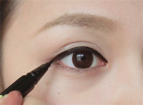 第三步:用眼线液从眼头开始,顺着眼睛的弧度开始画,从眼头开始慢慢描画向眼尾,至眼尾处向上挑起1cm左右。