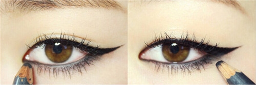 第五步:再次使用眼线笔,给下眼线作调整。画出下眼线的眼头,之后将眼尾部分与上眼线眼尾连接,轻轻画就可以了,下手不要太重,不然会显得很呆板。