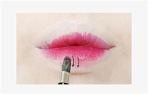 第四步:使用唇刷,蘸取唇膏,从下唇内侧由深到浅的晕染。