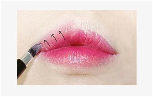 第五步:重复上一步刷满上唇,使唇部的渐变效果变得自然,外部颜色比中间颜色要浅。这一步要注意在晕染的时候不要涂满,将唇线以内2cm的地方空出。