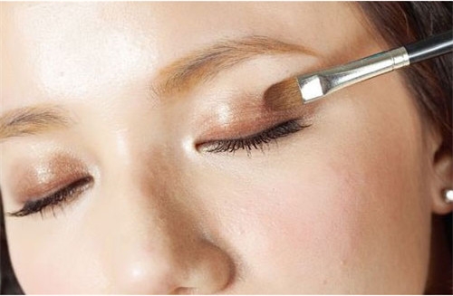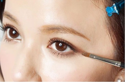 第一步:用眼影刷蘸取咖啡色眼影,在上眼皮涂抹,眼影范围不超过眼窝。