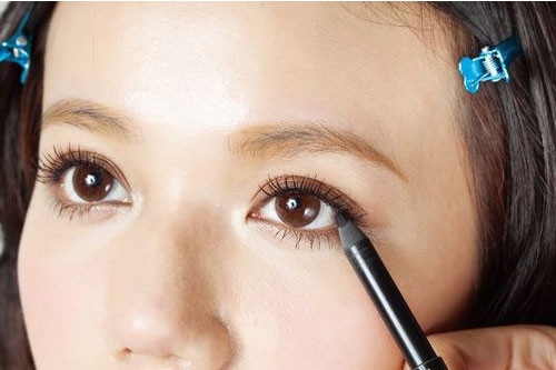 第二步:用眼线笔以点压的方式填补睫毛空隙,塑造埋入式自然眼线,内侧黏膜处以黑色填满。