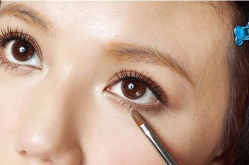 第三步:用眼影刷蘸取咖啡色眼影,画咖啡色下眼线,眼头处留白,从瞳孔下方描绘0.5cm宽眼影到眼尾。