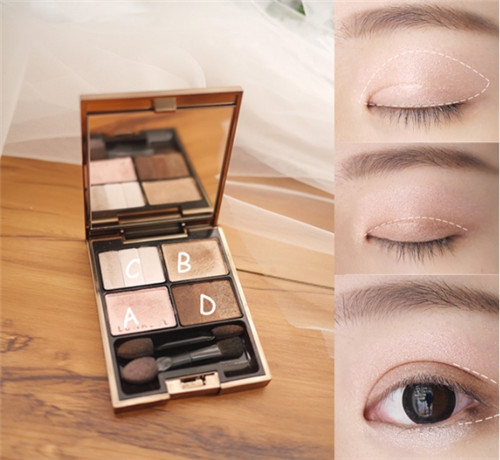 第三步:先用A涂抹整个眼窝,再用B涂抹于双眼皮褶处,最后用D在眼尾晕染开来。