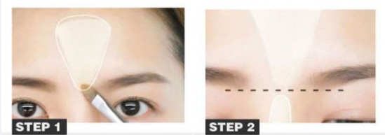 第一步:用刷子蘸取修容粉在额头中央描绘出倒三角形,从眉头中心开始,越向上越宽,额头看起来才会越长,脸型相对也会变长。