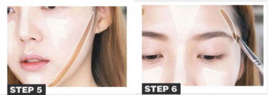 第五步:用刷子蘸取修容粉从颧骨往下巴,直接一笔画下来,斜度越高越能呈现消瘦感,涂抹的范围请留意不要太厚。