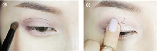 第六步:用手指蘸取少量珠光眼影粉,轻轻点在眼皮中间。