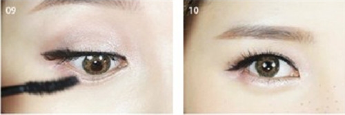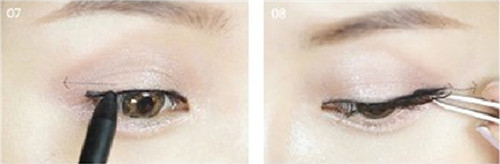第七步:用眼线液笔沿着睫毛由眼头向眼尾方向描绘。