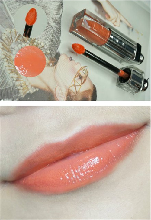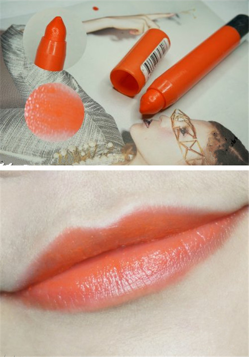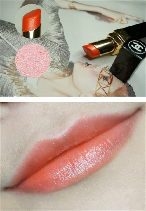 特点:比较正的橙色,上嘴很显白,带有一点小亮片加上膏体本身的滋润光泽,让嘴唇呈现丰盈饱满的感觉,不需要太繁杂的唇部护理就可以涂上出门了。