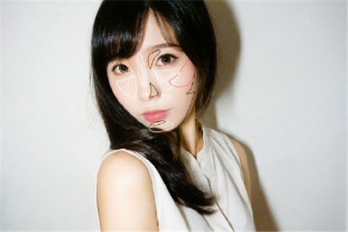 高光:在上底妆之前,将提亮液点涂在鼻梁、鼻子两侧脸颊上、下巴处。之后均匀的涂抹开。注意鼻梁上的提亮液不需要涂抹至鼻头,这样针对鼻根较塌的情况更能增加立体感。