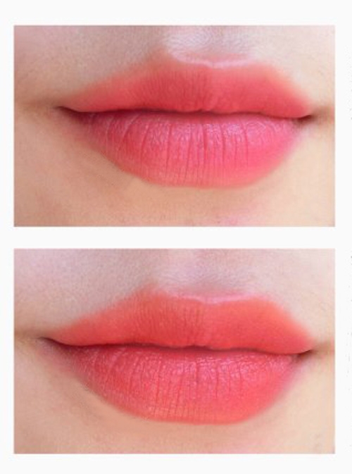 2、再用口红以点涂的方式上妆,如果是嘴唇薄的姑娘,上嘴唇的边缘也要涂上。