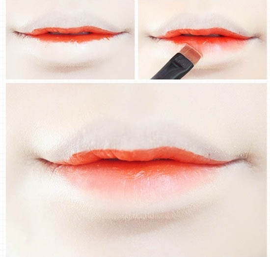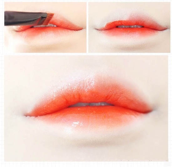 用另一只唇刷沾取浅色唇蜜或者唇彩,由内至外的涂抹,将深色唇色部分的晕染稍稍扩大一点,在涂抹过程中不要忘记了修饰唇角和唇部边缘。