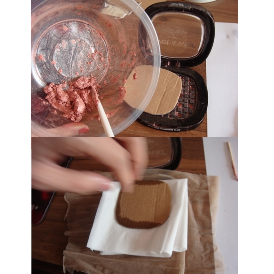 看纸巾的湿度来更换纸巾,大概换4张左右就可以吸得差不多了,这一步就基本完工了,然后将粉饼盖上个丝袜,放在阴凉通风处,等酒精挥发完就好。