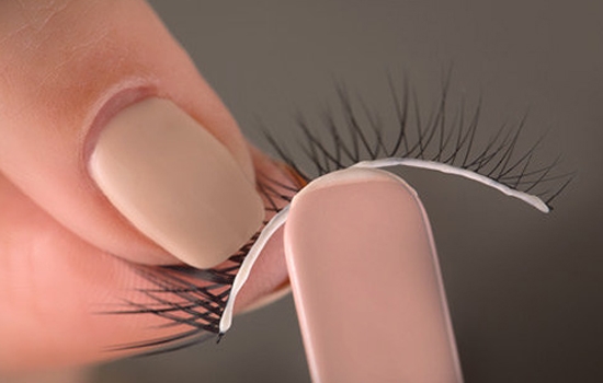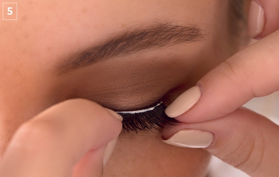 瞄准你的睫毛顶部,不要碰到触摸眼睑。胶水干得很清楚,所以不要担心会粘到别处。用双手戴好假睫毛。如图方式。