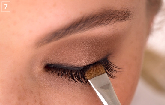 如果你看到你的睫毛和眼睑之间并且呈现出缺口,别担心!你不需要重新戴,只是填补缺口,用哑光黑色眼影作为眼线隐藏它(我们使用391自由度系统英格特化妆品眼影)。这一步也有助于胶水干得更快。