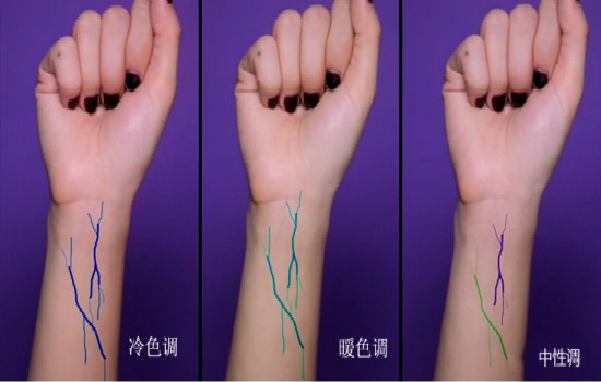 如图所见,如果手腕的血环偏蓝色紫色多一些,那你的肤色就是冷色调,如果偏绿色的比较多,那你的肤色就是暖色调,如果既可以看见紫色、绿色,还能见到一些少许的蓝色这类几种颜色混合在一起的情况,那么你的肤色就是中性色。