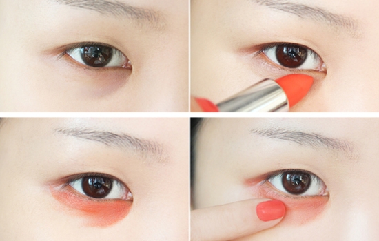 2.选择一只偏橘色的滋润型口红,一定要是偏橘色的,因为黑眼圈一般为紫青色,可以用橘色中和。滋润的质地可以避免眼周太干而卡粉。