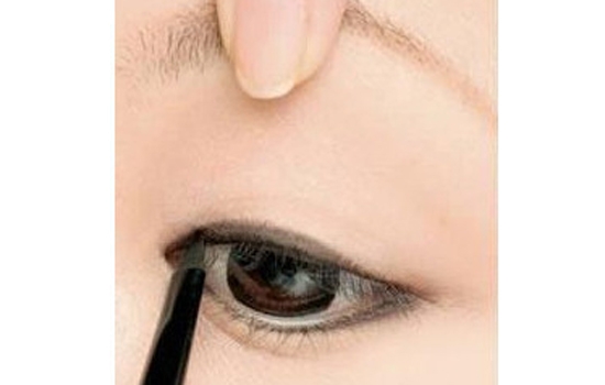 画的时候,用手将眼皮张开一下,如图所示。将笔立起来一些,将多余的眼线膏擦掉一些,立体感就出来了。