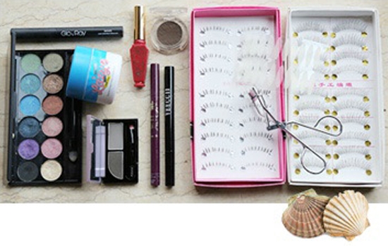 蕾珂美懒人面霜、宽型双眼皮贴、Kiss me眼线液、Sleek眼影盘594#、爱丽小屋单色眼影PK008#、Thefaceshop睫毛夹、手工上假睫毛217#、自然款下睫毛、Carslan大眼睛眉粉1#、Glo&ray睫毛膏、Canmake持久渐变染唇液2#