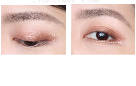 步骤3:然后用小号的锥形刷沾取爱丽小屋br410,从眼尾三角区域慢慢画到接近眼头,边缘地方用干净的刷子晕开。