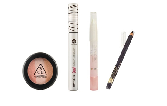 大地色眼影盒,一只棕色眼线笔,一只白色眼影笔,一只睫毛膏。