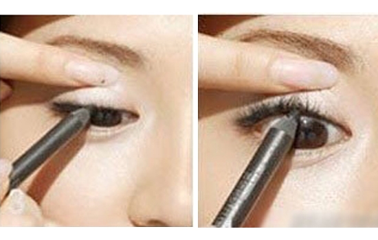 如果想让眼睛看起来更大一点,可以在下眼皮粘膜处用白色眼线笔描绘,这样可以增加眼白的面积。然后用深棕色的眼线笔将下睫毛根部填满。