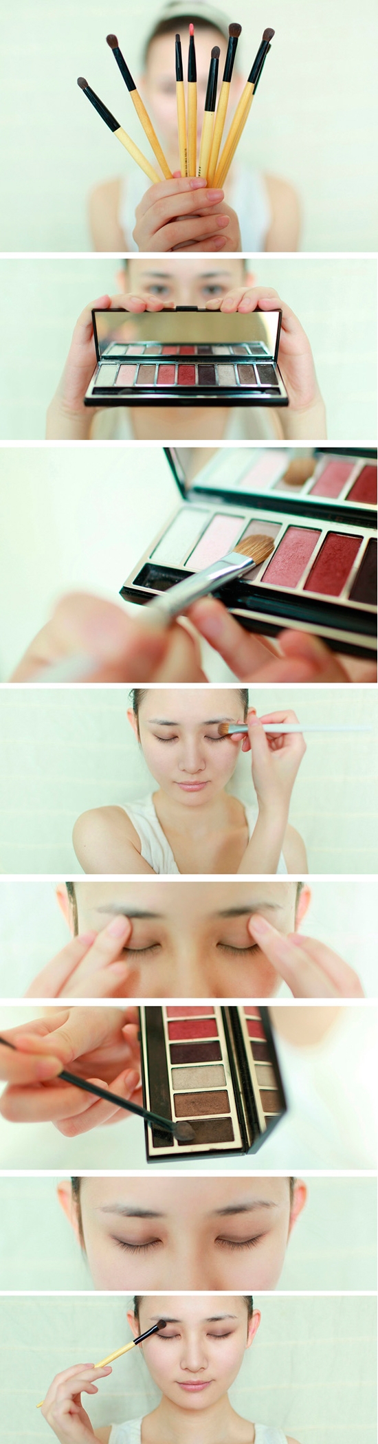 1.这是需要用到的彩妆工具,眼影盘是大地色系,还有青春不失稳重的豆沙红色系,如果没有一样的颜色,类似的眼影颜色搭配也可以。