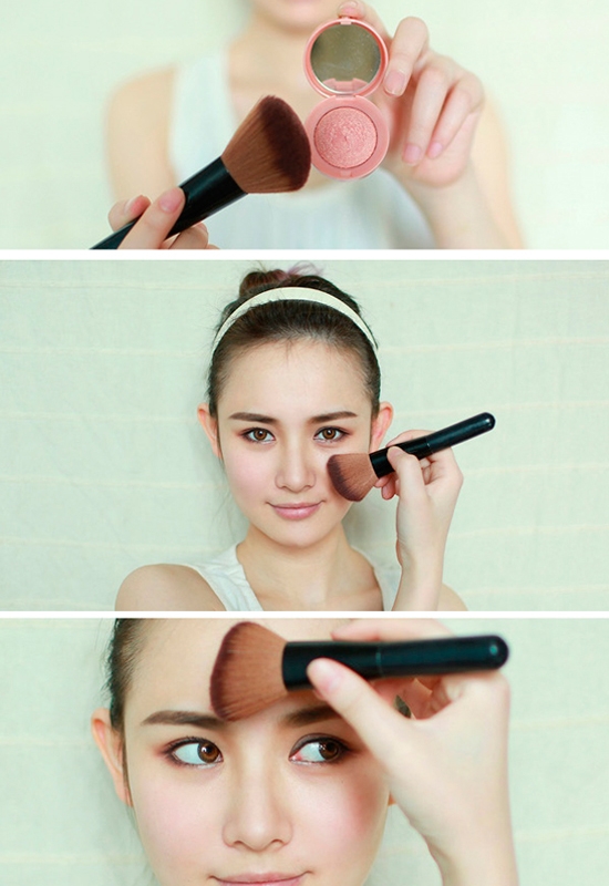 1.腮红刷一般是斜面的,这样服帖脸部,腮红颜色的选择也是看个人,模特皮肤较白,且敏感肤质本身脸颊处偏红,所以选择颜色清淡的腮红。