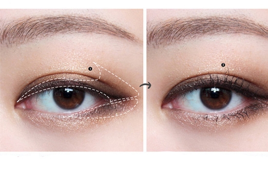 步骤四:用更深的棕色眼影晕染在图中白色虚线内,打造出富有层次感的烟熏妆。